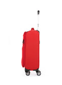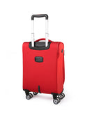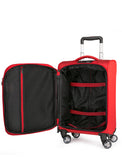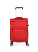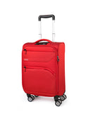Letvægts kabine kuffert i chili rød med 4 lydløse dobbelt hjul. Kufferten kan ekspanderes fra 20 cm til 24 cm i dybden. Teleskopstængerne er i aluminium for at give lethed til kufferten. Kabine kufferten har dobbeltlags lynlåse, hvilket gør lynlåsen langt kraftigere end traditionelle lynlåse. Kufferten har en indbygget TSA kodelås i toppen. Indvendigt er kufferten foret i stof, samt 2 støttende stropper i bunden, som holder tøjet på plads. Udvendigt er der 2 lettilgængelige frontlommer med lynlåse. Alle dele såsom hjul, låse, håndtag osv. er monteret med skruer så alt kan udskiftes på kufferten hvis lufthavnspersonalet skulle mishandle kufferten. En perfekt kabine kuffert til dig, som leder efter en ny kuffert med gode hjul og et let materiale til den bedste pris. Kufferten er godkendt som kabinestørrelse hos langt de fleste flyselskaber, vi anbefaler dog altid at man læser reglerne til det flyselskab man skal flyve med først, da størrelsen til en kabine kuffert kan variere afhængigt af flybilletten.