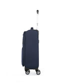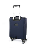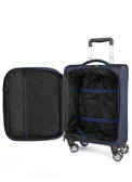 Letvægts kabine kuffert i Navy blå med 4 lydløse dobbelt hjul. Kufferten kan ekspanderes fra 20 cm til 24 cm i dybden. Teleskopstængerne er i aluminium for at give lethed til kufferten. Kabine kufferten har dobbeltlags lynlåse, hvilket gør lynlåsen langt kraftigere end traditionelle lynlåse. Kufferten har en indbygget TSA kodelås i toppen. Indvendigt er kufferten foret i stof, samt 2 støttende stropper i bunden, som holder tøjet på plads. Udvendigt er der 2 lettilgængelige frontlommer med lynlåse. Alle dele såsom hjul, låse, håndtag osv. er monteret med skruer så alt kan udskiftes på kufferten hvis luthavnspersonalet skulle mishandle kufferten. En perfekt kabine kuffert til dig, som leder efter en ny kuffert med gode hjul og et let materiale til den bedste pris. Kufferten er godkendt som kabinestørrelse hos langt de fleste flyselskaber, vi anbefaler dog altid at man læser reglerne til det flyselskab man skal flyve med først, da størrelsen til en kabine kuffert kan variere fra flyselskab til flyselskab.